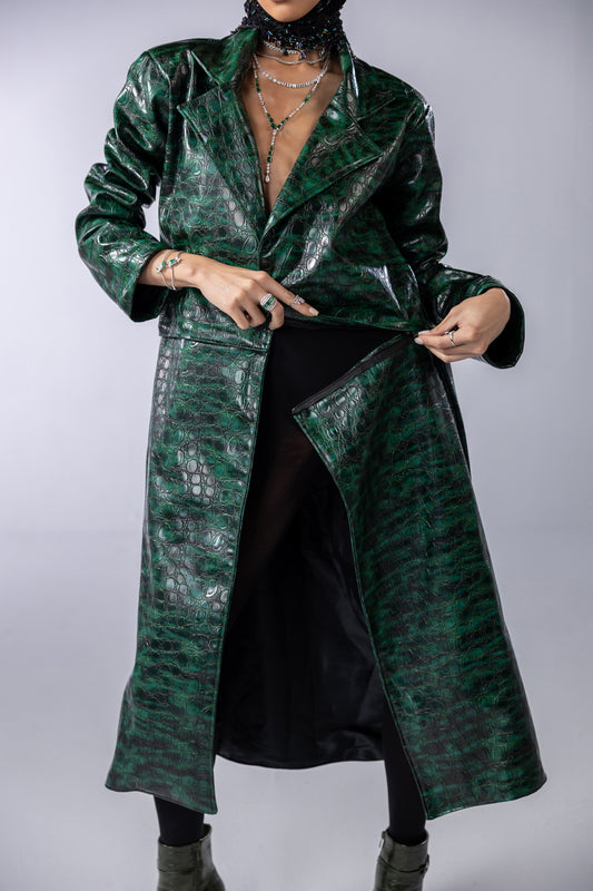 long olive green snake print coat.